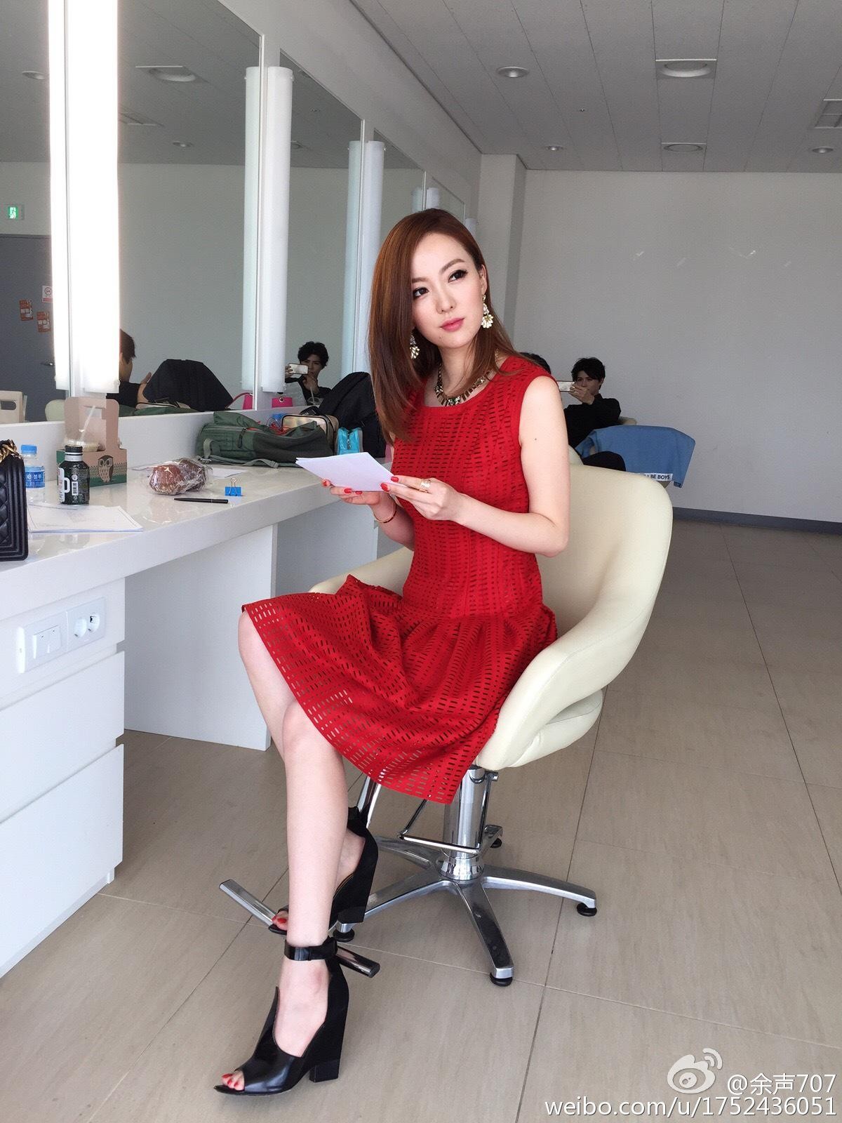余声手持手卡认真准备,红色裙装与专注神情构成动人画面